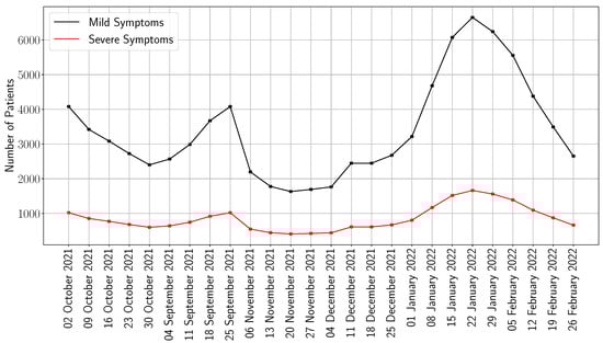 Weekly number of mild and severe cases in Northern Virginia, 2 October 2021–26 February 2022 [43].