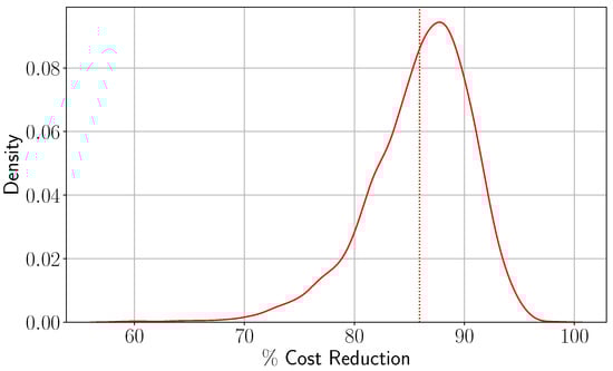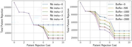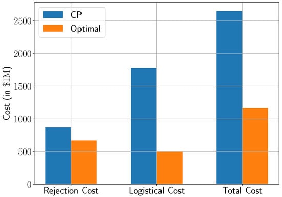 Figure 4 presents the expected healthcare costs across both approaches, decomposed into rejection costs and logistical costs. The bar on the right represents the total system cost, which is the sum of both costs. The optimized framework achieves a substantial reduction in total cost, decreasing from over USD 2647 billion under CP to approximately USD 1161 billion, representing a savings of more than 56%.