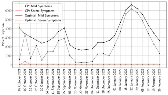 In order to show the effectiveness of our framework, we consider a case study that utilizes the data for the COVID-19 outbreak in the NOVA area. By September 2021, hospitals in NOVA were already approaching capacity due to the rise in COVID-19 cases and faced additional strain with the arrival of Afghan refugees. According to the Virginia Hospital and Healthcare Association, hospitalizations increased by 1008% and new cases rose by 1217% over a two-month period, resulting in severely overcrowded emergency rooms and widespread staffing shortages across the state [16]. To that end, we consider the weekly number of infections reported by the Centers for Disease Control and Prevention (CDC) from 2 October 2021 to 26 February 2022 in NOVA [43]. Recall that the number of infections is translated into patient demand in our model (using (1) and (2)). In Figure 3, we show the weekly patient demand in NOVA. As is noticeable, the demand is split into two categories: mild and severe symptoms, i.e., . Given that the CDC reports weekly deaths for a given state, we first extract the weekly deaths in the state of Virginia and then estimate the weekly infections, considering that the mortality probability is 2% [44]. To limit the analysis to the NOVA area, we multiply the weekly infections by 30% (this is based on the fact that the proportion of the NOVA population in Virginia is 30%) [45]. We then split the number of infections into mild and severe symptoms using the proportions 80% and 20% (resp.) [46]. From the perspective of our model, the key distinction between subjects experiencing mild versus severe symptoms is that mildly symptomatic individuals require hospitalization with standard care beds, whereas those with severe symptoms necessitate intensive care unit (ICU) support and/or mechanical ventilation.