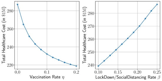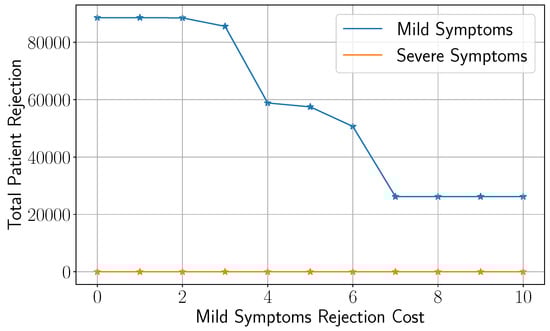 Suppose that the cost of shortage is 0, that is, for all and . Then, in this case, no patients should be hospitalized and no one should enter the system, that is, . Consequently, with the initial state conditions, all decision and state variables are trivially set to 0, which means that . Thus, Assumption 1 enriches the problem and highlights its importance for further study. Next, we turn our attention towards the computational aspects of Problem (9).