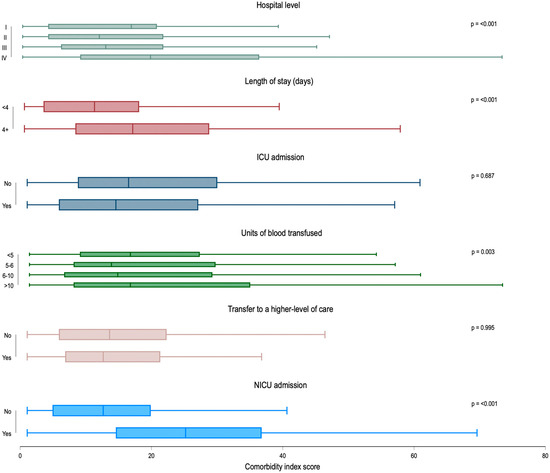 In addition, using chi-square analyses and box-plots, we compared mean and median patient comorbidity scores by hospital level of care (levels I–IV) as well as the following adverse outcomes: length of stay (<4 versus ≥4 days), ICU admission among those with blood product transfusion ≥ 4 units, units of blood products transfused (divided into quartiles: ≤4, 5–6, 6–10, ≥10 units), NICU admission among those with live birth deliveries, and transfer to a higher level of care (among those first admitted to a lower level facility).
