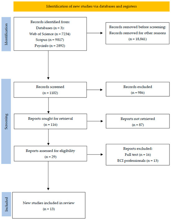 An initial search using the selected descriptors yielded 19,943 articles across the three databases used in this review. It is important to note that when the keyword “Early Childhood Intervention” was added to the search, no articles were found in any of the databases, which underscores the contribution of Robles-Bello and Sánchez-Teruel [3], who highlight the scarcity of research in the field of early childhood care and its young professionals. In light of these findings, the existing literature on healthcare and young mental health professionals (early-career professionals) will be analyzed.