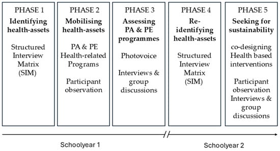 The intervention was developed collaboratively between the research team and the participating schools from October 2020 to May 2022 and included five main phases (see Figure 1). It comprised a series of co-designed, school-based activities aimed at promoting healthy lifestyles through active and participatory pedagogical strategies. Specifically, collaboration was embedded throughout the process and included (i) obtaining consent and offering a structured training programme, as well as several preparatory meetings to tailor the intervention to the context of each school, prior to implementation; (ii) jointly identifying health assets through SIM sessions; (iii) co-designing and implementing PA and health-related PE programmes; (iv) evaluating these programmes using PAR strategies; and (v) maintaining an ongoing dialogue between researchers, teachers and students through meetings, interviews and group discussions.