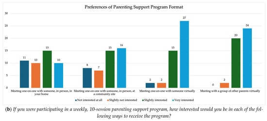 The vast majority (93.5%) of participants were very or slightly interested in participating in a parenting support program. Most (56.5%) believed that other parents would be interested, while 41% were unsure. Parents believed that the most important topics included how to manage their child’s behavior and communicate well with children, coping with stress related to being a parent, how to help children develop healthy habits (i.e., related to screen time, physical activity, and sleep), and how to help children with their mood and emotions (Figure 2a). When asked about modality preferences, parents expressed the greatest interest in one-on-one and group virtual delivery (Figure 2b). Moderate interest emerged in in-person individual delivery at a community site. Parents were least interested in one-on-one in-person delivery at home.