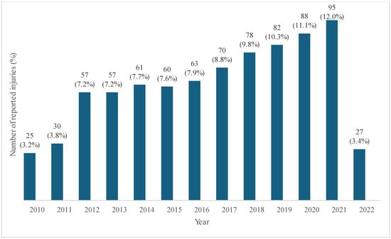3.1. Number of Reported Injuries (%) Between 2010 and 2022