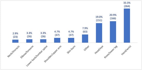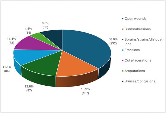The types of injuries were analyzed in 769 contacts (97% of all reported injuries). Open wounds were the most frequently reported types of injuries (38%), followed by burns/abrasions (14%) and sprains/strains/dislocations (12.6%), which all together represented more than three-fifths of all reported injuries (Figure 3).