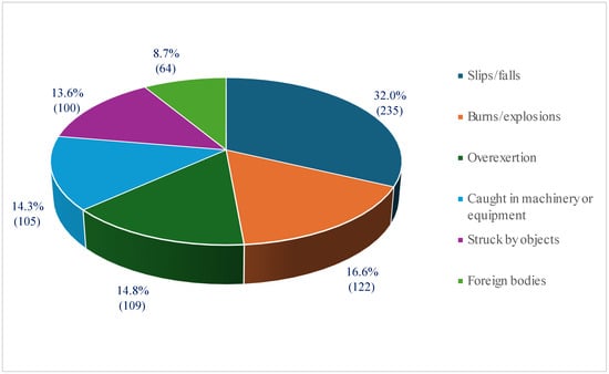 Causes of accidents were analyzed in 735 cases (92.7% of all reported injuries). Slips/falls were the leading cause of injuries, accounting for 32%, followed by burns/explosions (16.6%) and overexertion while lifting or carrying items (14.8%) (Figure 4).