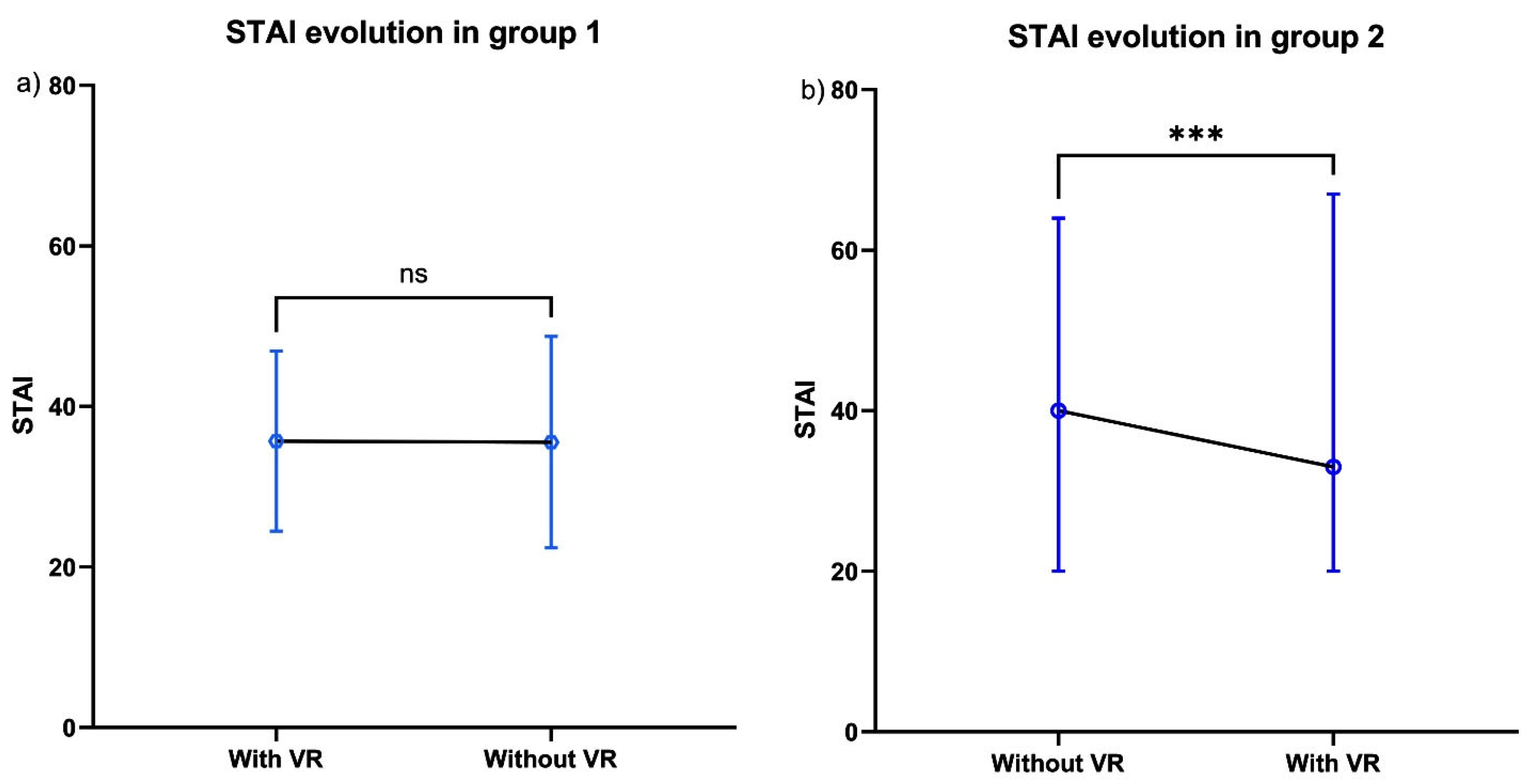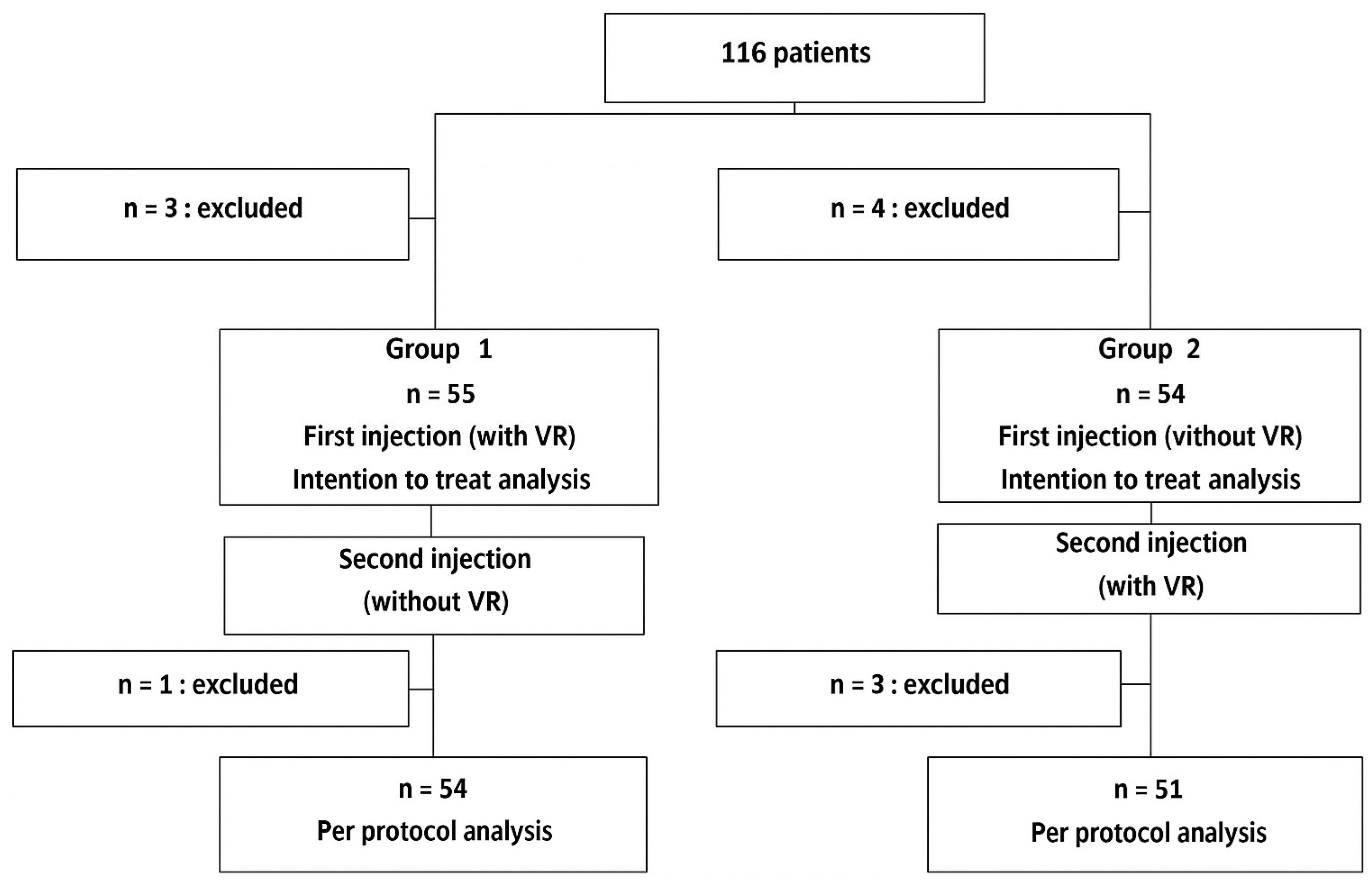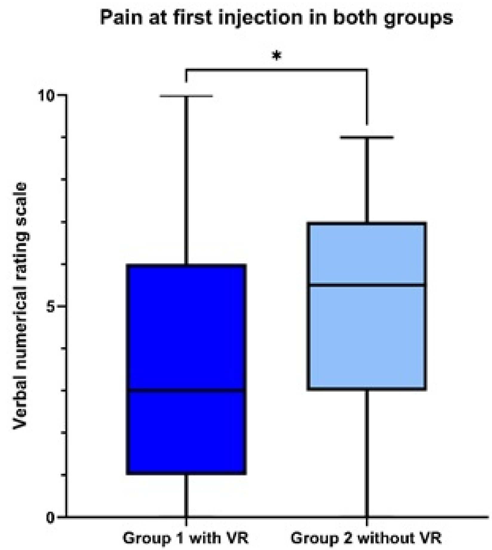 - Secondary endpoints were anxiety during the injection procedure, as assessed by the STAI, level of satisfaction with the use of the VR headset (measured on a scale from 0 to 10), and safety (occurrence of any one or more adverse events from among the following: discomfort; asthenia; sleepiness; headache; vertigo; difficulty concentrating; nausea; eye fatigue; eye pain; visual fatigue; blurred vision). These adverse events were commonly described in the literature. Furthermore, satisfaction was measured on a scale from 0 to 10 (not satisfied to very satisfied). It was a bespoke measurement.