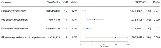 | Pregnancy hypertension | 15 | 1.076 (1.014, 1.143) | 0.016 | 1.078 (1.031, 1.128) | 9.18 × 104 | 1.078 (1.024, 1.134) | 0.004 | 1.109 (1.023, 1.202) | 0.012 |