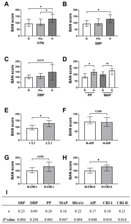 Distribution and correlation of BAN score across different cardiometabolic risk categories. (A) BAN score by blood pressure status: normotensive (N), prehypertensive (Pre), hypertensive (H). BAN score stratified by (B) systolic blood pressure and (C) diastolic blood pressure. (D) BAN score levels among individuals with normal and elevated pulse pressure (PP) and mean arterial pressure (MAP). (E) BAN score by glycemic status (normal vs. elevated HbA1c). BAN score distribution across normal and high categories of atherogenic lipid indices: (F) AIP, (G) CRI-I, and (H) CRI-II. (I) Spearman correlation coefficients between BAN score and cardiometabolic parameters, including SBP, DBP, pulse pressure (PP), MAP, HbA1c, AIP, CRI-I, and CRI-II. Statistical comparisons were conducted using the Kruskal–Wallis test or Kolmogorov–Smirnov test as appropriate. p < 0.05 was considered statistically significant. Abbreviations: ns denotes no statistical significance (p ≥ 0.05), while * denotes p < 0.05.