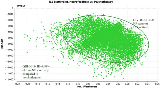 Figure 1 displays the incremental cost (Y axis) and incremental effectiveness (X axis) of neurofeedback (NF) compared to psychotherapy. The scatterplot demonstrates that NF is less costly than psychotherapy 88 percent of the time and both less costly with improved effectiveness 12 percent of the time when evaluated in a Markov model (10,000 iterations).