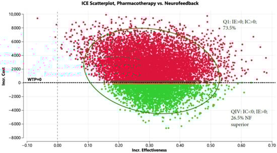 Incremental cost-effectiveness scatterplot comparing pharmacotherapy to neurofeedback (Red represents pharmacotherapy and green represents NF+OT).