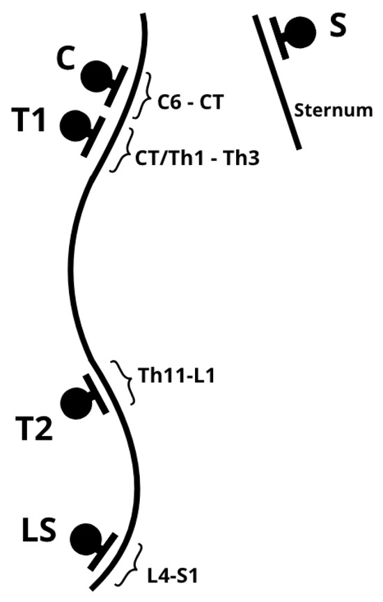 Rippstein plurimeter application points. C: Cervical spine with cervicothoracic junction (C6–CT), T1: Cervicothoracic junction with the upper thoracic spine (CT/Th1–Th3), T2: Lower thoracic spine with thoracolumbar junction (Th11–L1), LS: Lumbosacral junction (L4–S1), S: Upper sternum.