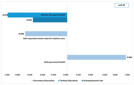 Table 4 presents correlation analysis among health outcomes and social determinants. The analysis revealed a strong negative correlation between healthy life years at birth and the unemployment rate (r = −0.814), while a strong positive correlation was observed with the employment rate (r = 0.810). Self-perceived health demonstrated low positive correlations with the employment rate (r = 0.642), primary education (levels 0–2) (r = 0.566), and secondary education (levels 3–4) (r = 0.679). The prevalence of long-standing illnesses or health problems reported by individuals showed moderate negative correlations with primary education (levels 0–2) (r = −0.820). In contrast, it had positive correlations with secondary education (levels 3–4) (r = 0.728) and tertiary education (levels 5–8) (r = 0.861). Lastly, limitations in usual activities demonstrated positive correlations with the unemployment rate (r = 0.602), secondary education (levels 3–4) (r = 0.541), and tertiary education (levels 5–8) (r = 0.712). Conversely, a negative correlation was found with primary education (levels 0–2) (r = −0.653).