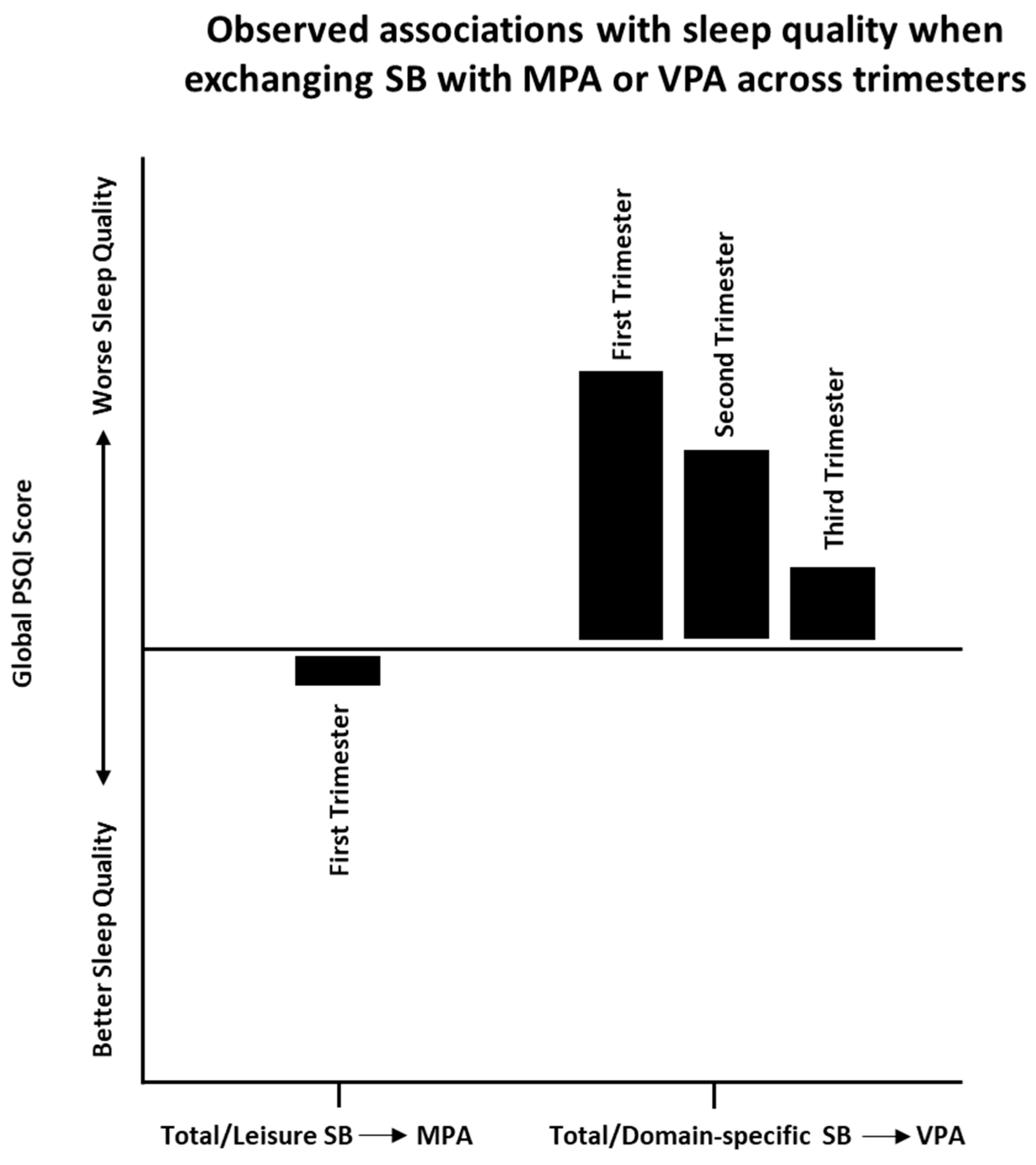 To our knowledge, this analysis is the first to investigate whether statistically reallocating SB to PA is a potential strategy for promoting sleep health during pregnancy. The primary findings are summarized in Figure 1. Consistent with the broader sleep health literature, substituting total or leisure SB on weekdays with the same duration of MPA was associated with favorable maternal sleep quality, specifically in pregnant women in their first trimester. Paradoxically, statistically replacing total or domain-specific SB with an equivalent amount of VPA was associated with poor prenatal sleep quality, especially during early pregnancy. Exchanging SB with MPVA or different domain-specific SB did not emerge as a promising strategy to enhance sleep quality during pregnancy. These novel findings indicate that the influence of replacing patterns and domain-specific SB with different PA on prenatal sleep quality is complex. The paradoxical relationships observed highlight the importance of considering patterns and domains of SB and intensity of PA used as a replacement, rather than total duration solely, to improve maternal sleep quality.