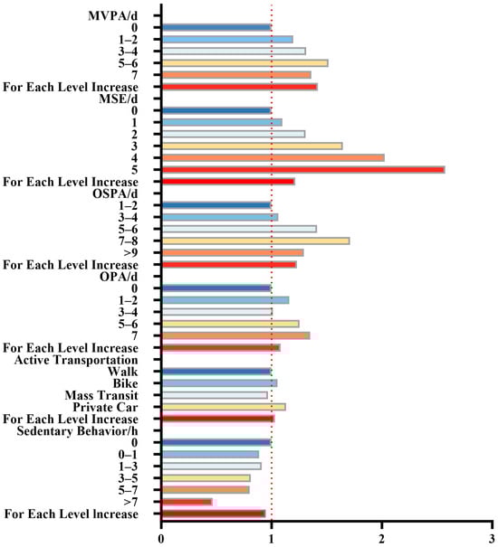 | Sedentary behavior/h | Cramer’s V = 0.055 ** | Cramer’s V = 0.032 ** | Cramer’s V = 0.050 ** | |||||