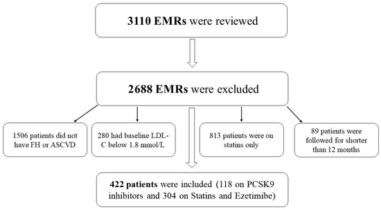 Out of 3110 medical files that were reviewed, 2688 patients were excluded, as shown in Figure 1. The number of patients who met the inclusion criteria and were included in the analysis was 422, of whom 118 were on PCSK9 inhibitors and 304 were on statins plus ezetimibe. The majority of patients on PCKS9 inhibitors (90.68%) were taking evolocumab, and only 11 patients (9.32%) were on alirocumab. Patients on PCSK9 inhibitors were younger than their counterparts on statins plus ezetimibe (51 years vs. 68 years, p-value < 0.001). Most patients were males (61.85%), with an average duration of illness of approximately five years. Moreover, the mean body mass index (BMI) was approximately 30, with no significant difference between patients treated with PCSK9 inhibitors and their counterparts on statins plus ezetimibe (29.59 vs. 30.59, p-value = 0.1090). Patients treated with statins plus ezetimibe were, on average, treated for a more extended period compared to their counterparts on PCSK9 inhibitors (5.39 years vs. 3.03 years, p-value < 0.001). Additionally, the percentage of patients treated with statins plus ezetimibe who had other comorbidities was higher compared to their counterparts on PCSK9 inhibitors (p-value < 0.05). For example, approximately 70% of patients treated with statins plus ezetimibe had diabetes, 20% had chronic kidney disease (CKD), 53% had hypertension, 24% had ST-elevation myocardial infarction (STEMI), and 51% had Non-STEMI elevation myocardial infarction (NSTEMI) compared to about 43%, 4%, 28%, 12%, and 24%, respectively, among their counterparts on PCSK9 inhibitors. In contrast, 19.5% of patients taking PCSK9 inhibitors reported being smokers, whereas only 0.33% of patients on statins combined with ezetimibe did so (p-value < 0.001). Finally, the baseline LDL-C level for patients on PCSK9 inhibitors was 5.19 mmol/L compared to 3.35 mmol/L among their counterparts on statins plus ezetimibe (p-value < 0.001); the mean levels of other lipid profile measures (HDL, triglycerides, and total cholesterol) were also higher among patients on PCSK9 inhibitors compared to their counterparts on statins plus ezetimibe as shown in Table 1.
