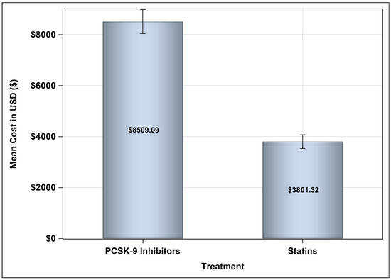 The mean annual medication costs for patients treated with PCSK9 inhibitors were USD 8509.09 versus USD 3801.32, resulting in a mean difference (MD) of USD 4707.76 ([95% CI: 4187.9–5227.6], p-value = <0.001), using the SFDA prices for prescription drugs, as shown in Figure 2. Moreover, the cost of prescription medications for patients treated with PCSK9 inhibitors accounted for approximately 51% of the total annual direct medical costs, compared to 33.69% among their counterparts, as shown in Figure 3.