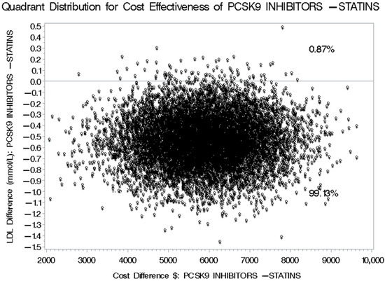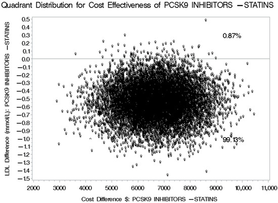 Bootstrap Distribution of Cost-Effectiveness: Comparative Analysis between PCSK9 inhibitors and Statins plus Ezetimibe for their impact on LDL-C levels based on SFDA Prices of Prescription Drugs.
