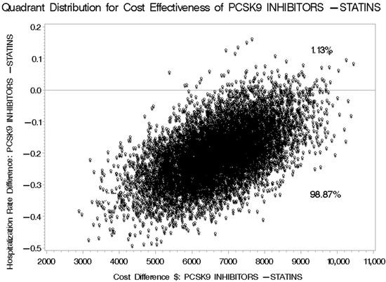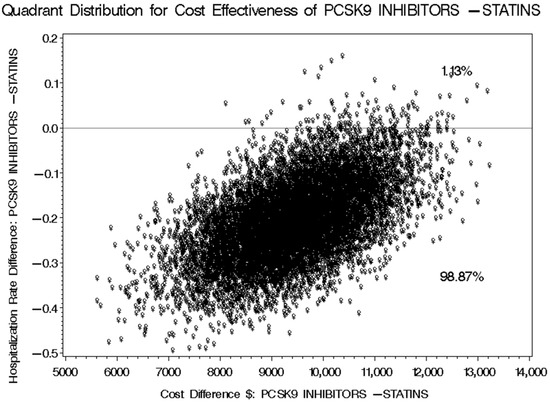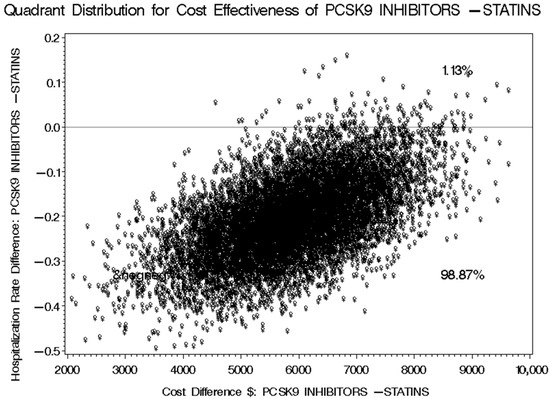 The mean number of cardiovascular-related hospitalizations for patients receiving PCSK9 inhibitors was 0.645, compared to 0.808 for those on statins plus ezetimibe. This results in a difference of −0.163 (95% CI: −0.287 to −0.0601) in favor of PCSK9 inhibitors, as detailed in Table 6. This variation in cardiovascular-related hospitalizations translates to an incremental cost-effectiveness ratio (ICER) of USD 46,374.23 (95% CI: 25,544.77 to 191,508.48), indicating the additional cost incurred for each avoided cardiovascular-related hospitalization when using PCSK9 inhibitors for managing hypercholesterolemia instead of statins plus ezetimibe, based on the prices set by the SFDA for prescription medications. Utilizing the discounted prices of PCSK9 inhibitors in public health institutions for the second (tender prices 2021–2023) and third (tender prices 2024–2026) scenarios would yield ICERs of USD 29,908.83 (95% CI: 16,109.89 to 145,908.31) and USD 24,684.05 (95% CI: 13,194.42 to 132,244.75), respectively, as presented in Table 7 and Table 8. The bootstrap cost-effectiveness distributions for these three scenarios generated two distinct quadrants. When comparing PCSK9 inhibitors to statins plus ezetimibe, the outcomes indicated that there would be higher costs and a greater number of cardiovascular-related hospitalizations 1.13% of the time, while 98.87% of the time, there would be higher costs and a reduced number of cardiovascular-related hospitalizations, as illustrated in Figure 9, Figure 10 and Figure 11.