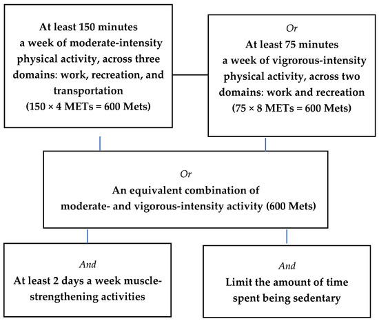 Recommend physical activity guidelines for optimal health benefits by WHO in adult and elderly men and women are presented in Figure 1 [14]. Weekly MVPA was subsequently categorized as either ≥600 MET-minutes or <600 MET-minutes according to WHO recommendations for optimal health benefits, which suggest at least 600 MET-minutes per week through a combination of moderate and vigorous physical activities [13]. Strength training was defined as being performed 2 or more days per week [14]. Sedentary behavior was assessed by daily sitting time in hours.