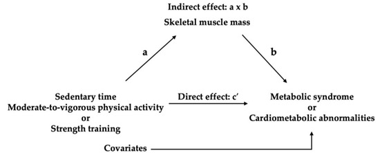 While no studies have specifically examined the indirect effect of sedentary behavior and physical activity on the cardiometabolic health as mediated by skeletal muscle mass, previous studies have reported a significant association between these factors. Sedentary time is associated with lower skeletal muscle mass, whereas performing MVPA and strength training are known to increase it [15,24,25]. Furthermore, reduced skeletal muscle mass is associated with insulin resistance, prediabetes, and MS [21,22]. Altogether, these findings suggest a potential mediational pathway where physical activity and sedentary time impact cardiometabolic health through their effects on skeletal muscle.