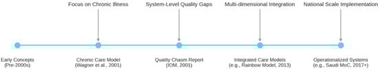 The application of systems thinking to healthcare is not entirely new, having evolved through several influential conceptual frameworks over recent decades (See Figure 1). Early efforts, such as Wagner’s Chronic Condition Model (CCM), highlighted the importance of productive interactions between informed, activated patients and prepared, proactive healthcare teams, crucially supported by integrated organizational resources and linkages to community services [11]. The CCM provided a practical blueprint for redesigning care for chronic conditions, emphasizing self-management support, delivery system design, decision support, and clinical information systems. Subsequently, the Institute of Medicine’s (IOM) landmark report, “Crossing the Quality Chasm,” issued a powerful call for fundamental healthcare system redesign to address pervasive deficiencies in safety, effectiveness, patient-centeredness, timeliness, efficiency, and equity [12]. It advocated adoption systems to create healthcare environments that reliably deliver high-quality care. More recently, frameworks like the Rainbow Model of Integrated Care have further elaborated on the multi-dimensional nature of integration required for effective systems-based care, encompassing clinical, professional, organizational, systemic, functional, and normative integration [13]. These models collectively underscore the need for coordinated efforts across micro (patient-provider), meso (organizational), and macro (policy/system) levels.