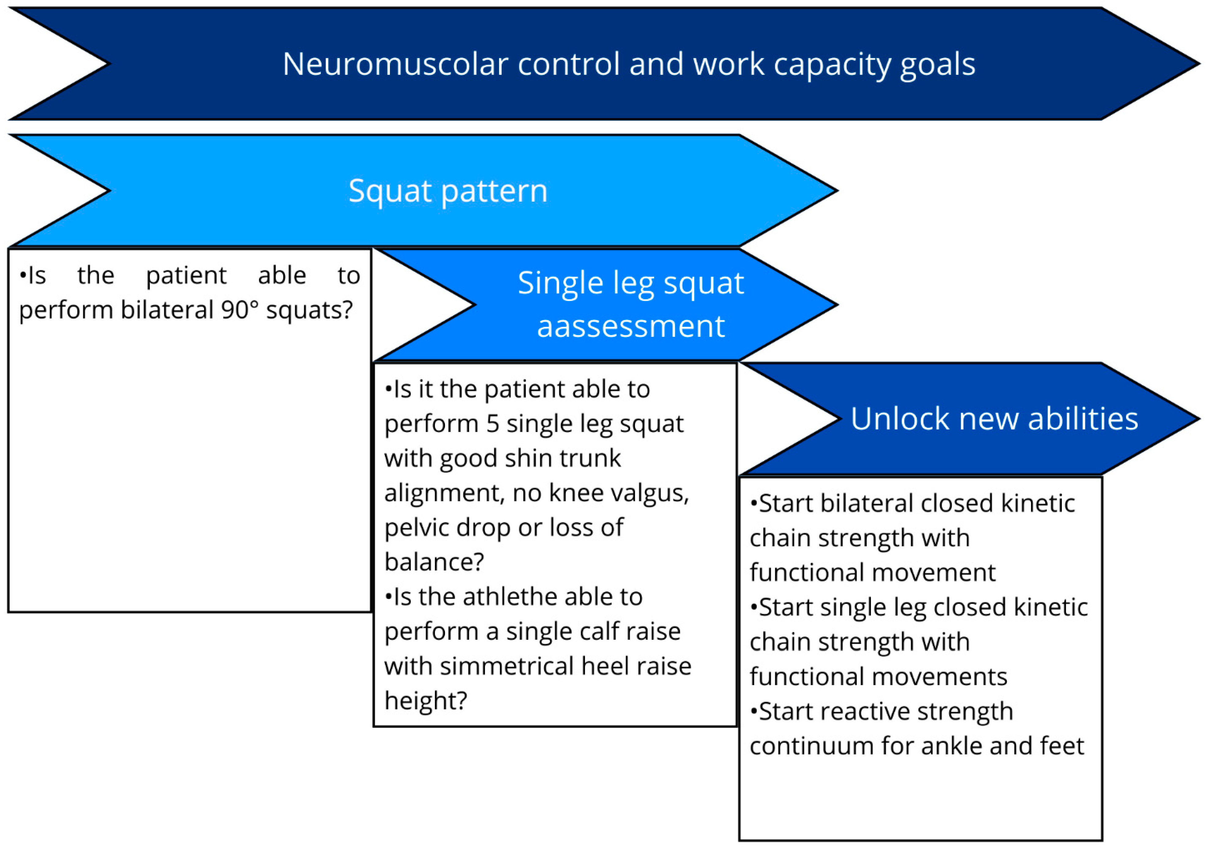(b) Neuromuscular Control And Work Capacity | Robust CKC motor control and sufficient work capacity; correct aberrant load distribution/kinematics before high-intensity strength [57,58,59,60,61,62]. | Single-leg squat quality; Y-Balance; step-down capacity; heel raise height (full plantarflexion readiness for calf endurance loading) [17,28,63,64,65,66,67]. | Advance strength when CKC control/work capacity (and heel raise) criteria are met and load progression is safe (Figure 4) [17,28,63,64,65,66,67]. |