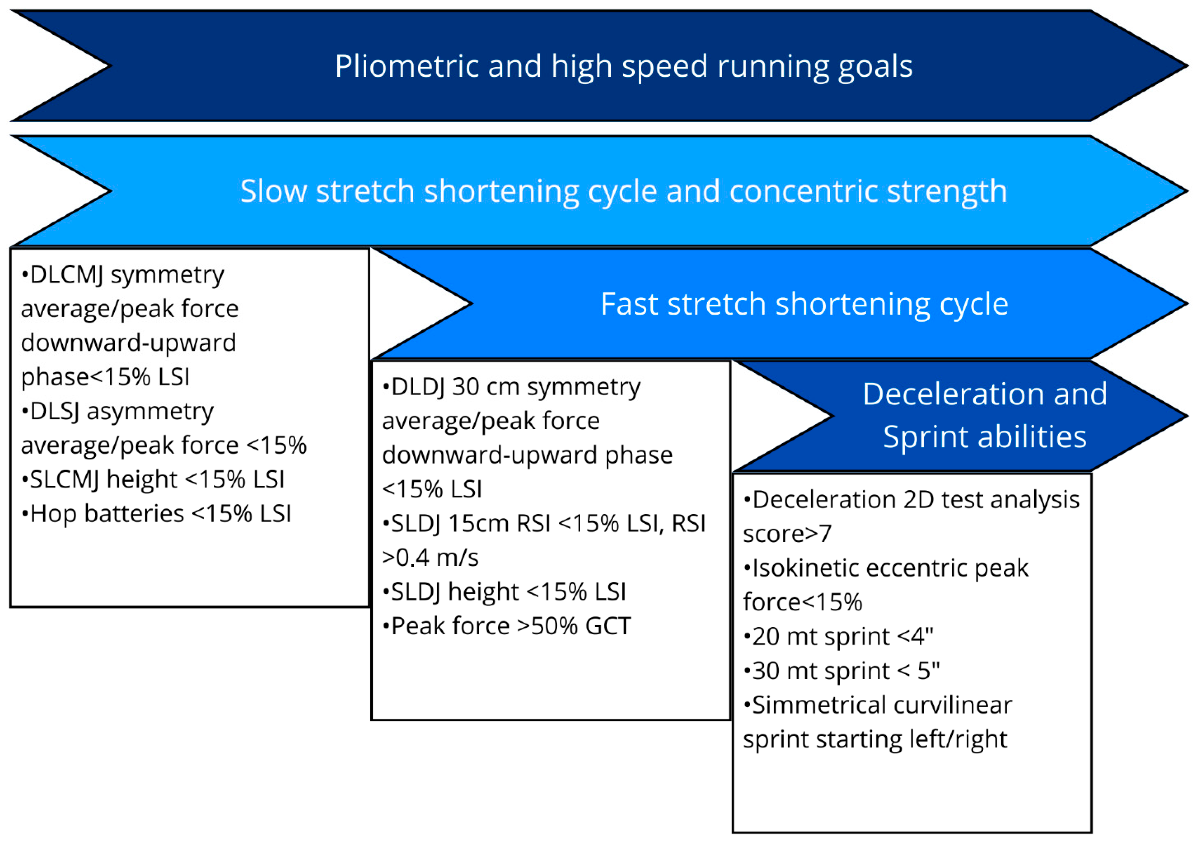 (d) Power And Linear Running | Progressive running for connective tissue conditioning and high vGRF tolerance; introduce COD only after strength goals; integrate gym + field; consider VBT for power at lower joint stress [24,27,82,83,84,85,86,87,88]. | DLCMJ, SLCMJ, DLDJ, SLDJ; metrics: jump height, LSI, RSI, GCT; add kinetic/kinematic strategies (second impulse, force at zero velocity) [29,89,90,91]. | Move to planned COD when phase targets are met (Figure 5) with symmetry in SLCMJ downward-phase impulse/velocity/force and adequate eccentric/isokinetic strength [94,95,96]. (Figure 5) |