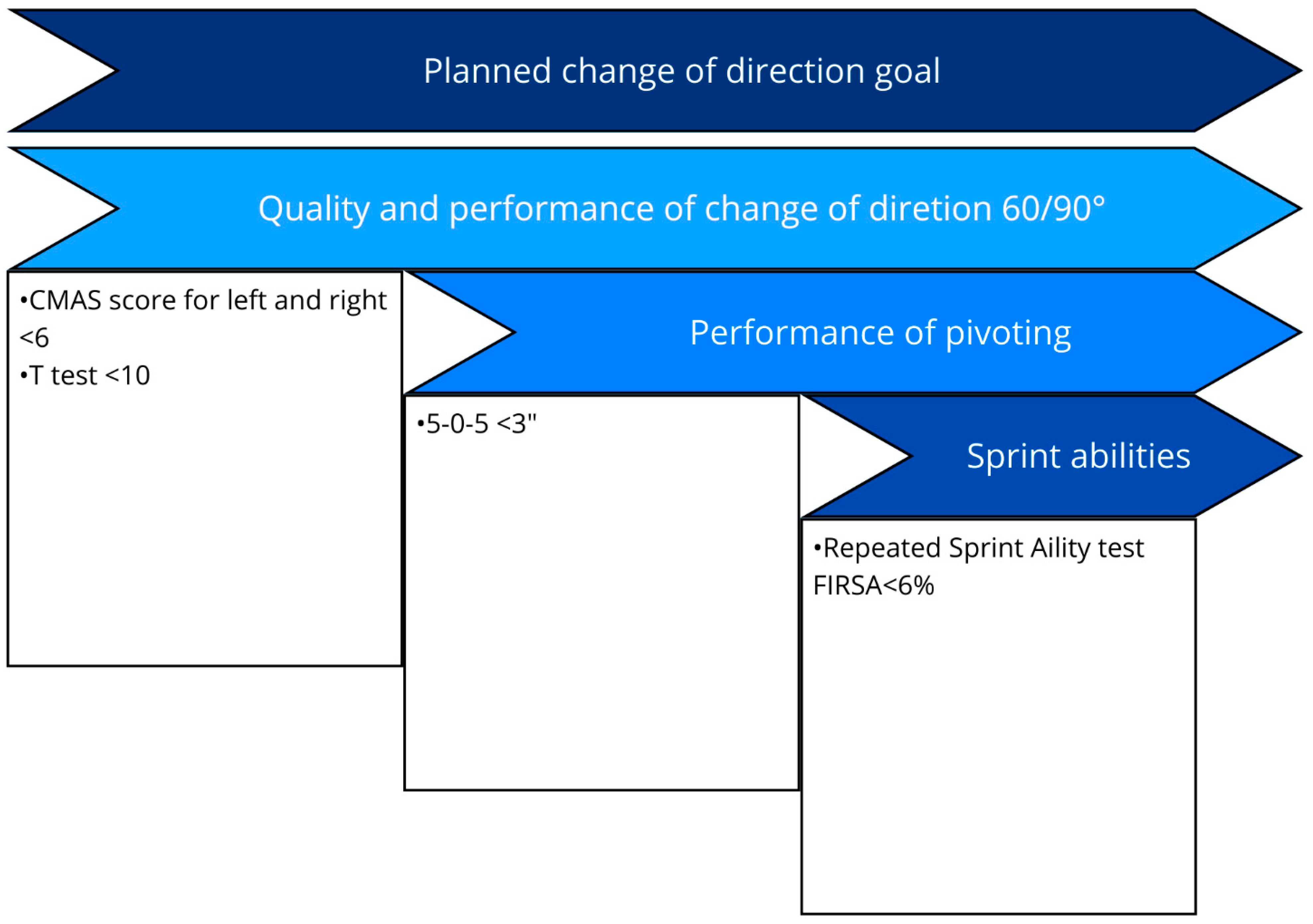 (e) Change of Direction (Planned) | Effective braking/force absorption with minimal GCT at high effort; eccentric quadriceps forces during cutting up to ~6 × BW [95,97,98,99]. | Planned COD tests (505, pro-agility) + CMAS; repeated-sprint ability; kinetic-informed interpretation to detect knee under-loading from fear/reduced capacity [100,101,102,103,104]. | Proceed to unplanned COD/agility after exposure to all variants across velocities and KPI attainment (Figure 6) [100,101]. (Figure 6) |