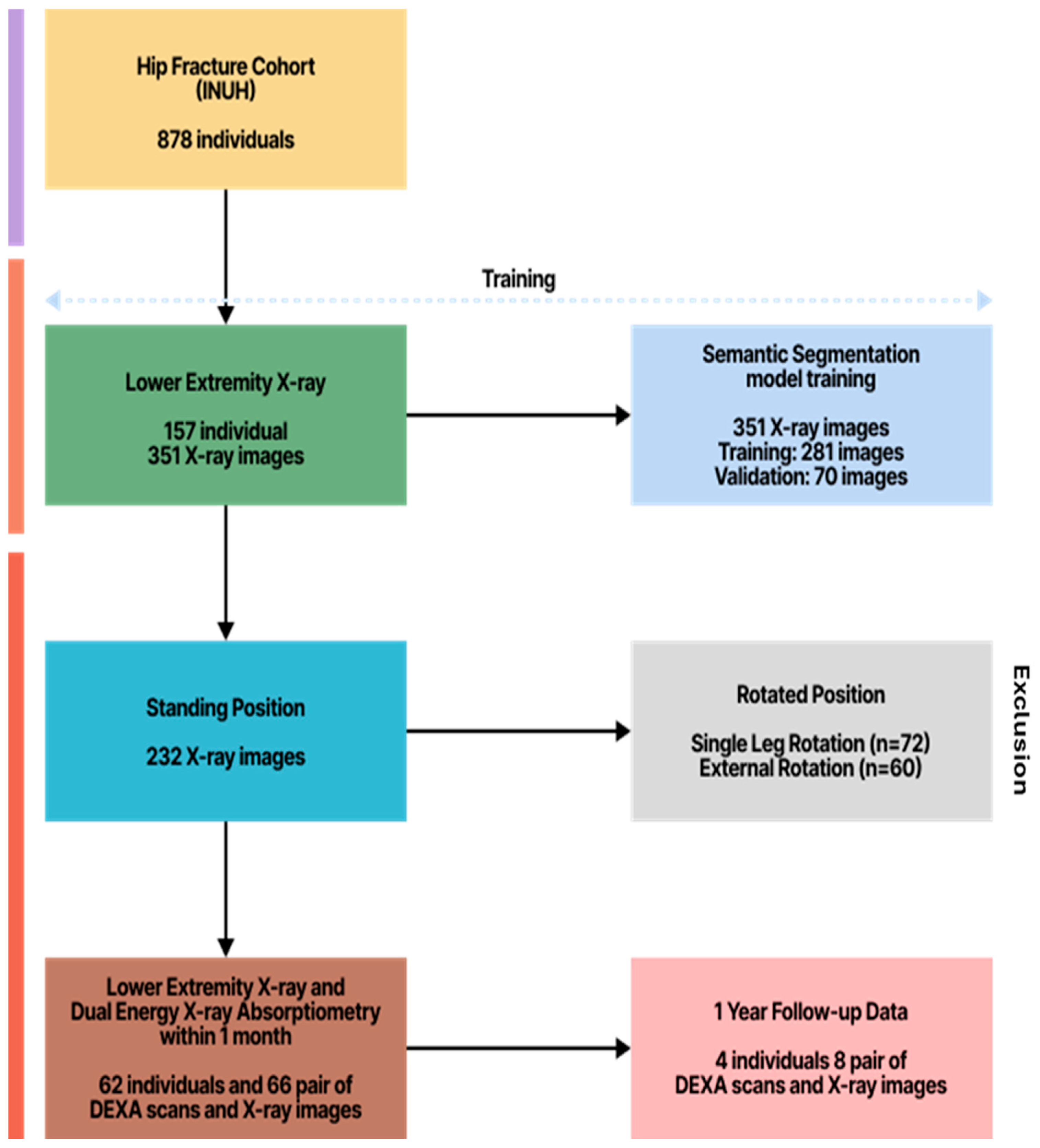 Initially, 878 individuals were identified, from whom 157 had lower extremity X-ray data (351 images). Among these, 351 images were ultimately used for semantic segmentation (281 for training and 70 for validation), after excluding 72 single-leg rotation images and 60 external rotation images due to rotation. For outcome analysis, 62 individuals provided 66 paired DEXA scans and X-ray images, and 1-year follow-up data from 4 individuals (8 paired DEXA scans and X-ray images) were also included for further discussion. The specific criteria for this study and the patient selection flowchart are detailed in