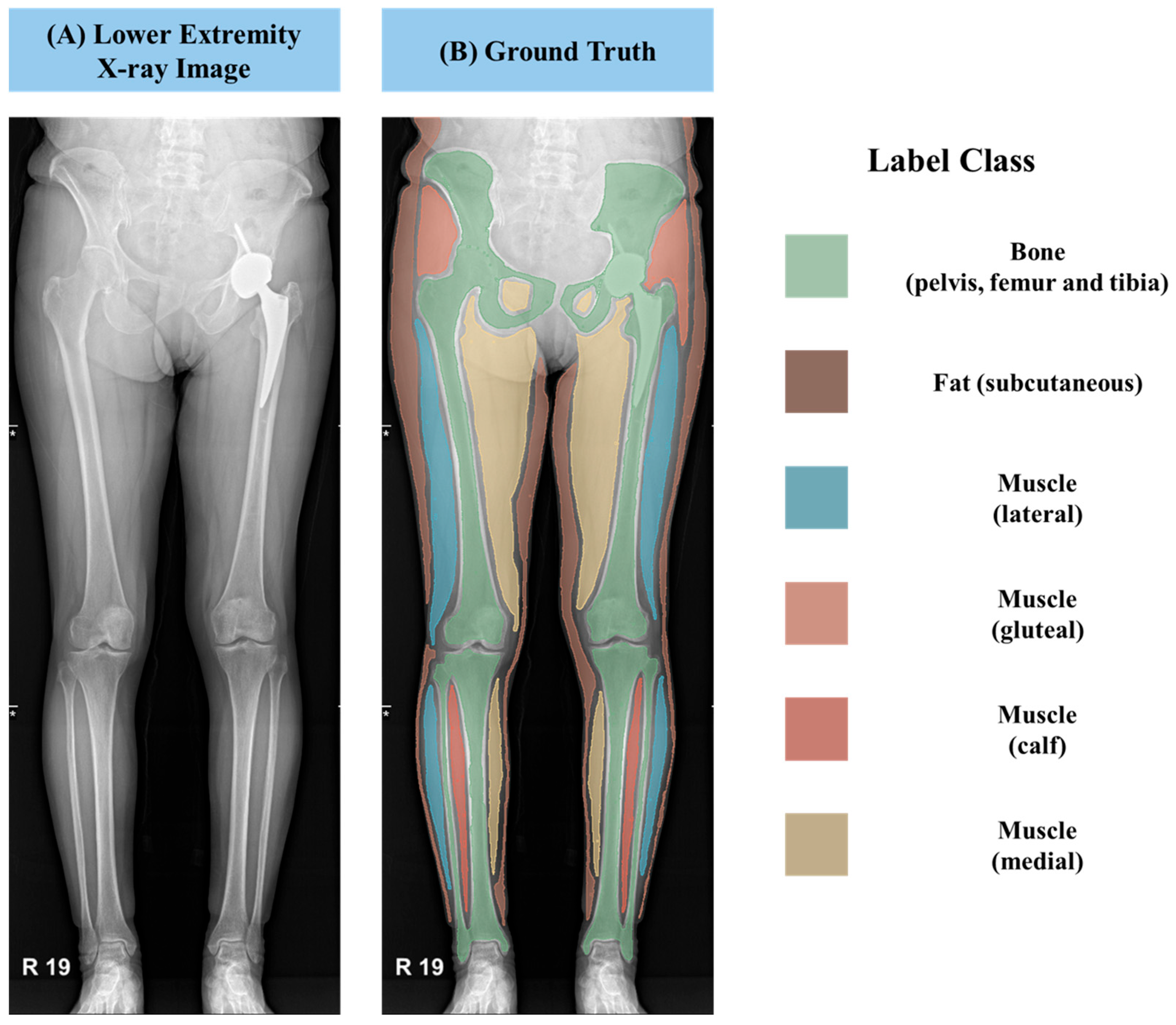 Figure 2, we segmented the muscles into three distinct classes: lateral, medial, and gluteal regions within the thigh, as well as the calf region. Furthermore, we annotated subcutaneous fat and bony structures such as the femur, tibia, and iliac bones. These meticulously labeled annotation masks were saved in the NRRD file format, which incorporates crucial information regarding pixel spacing in real-world units, enabling accurate quantification and analysis.