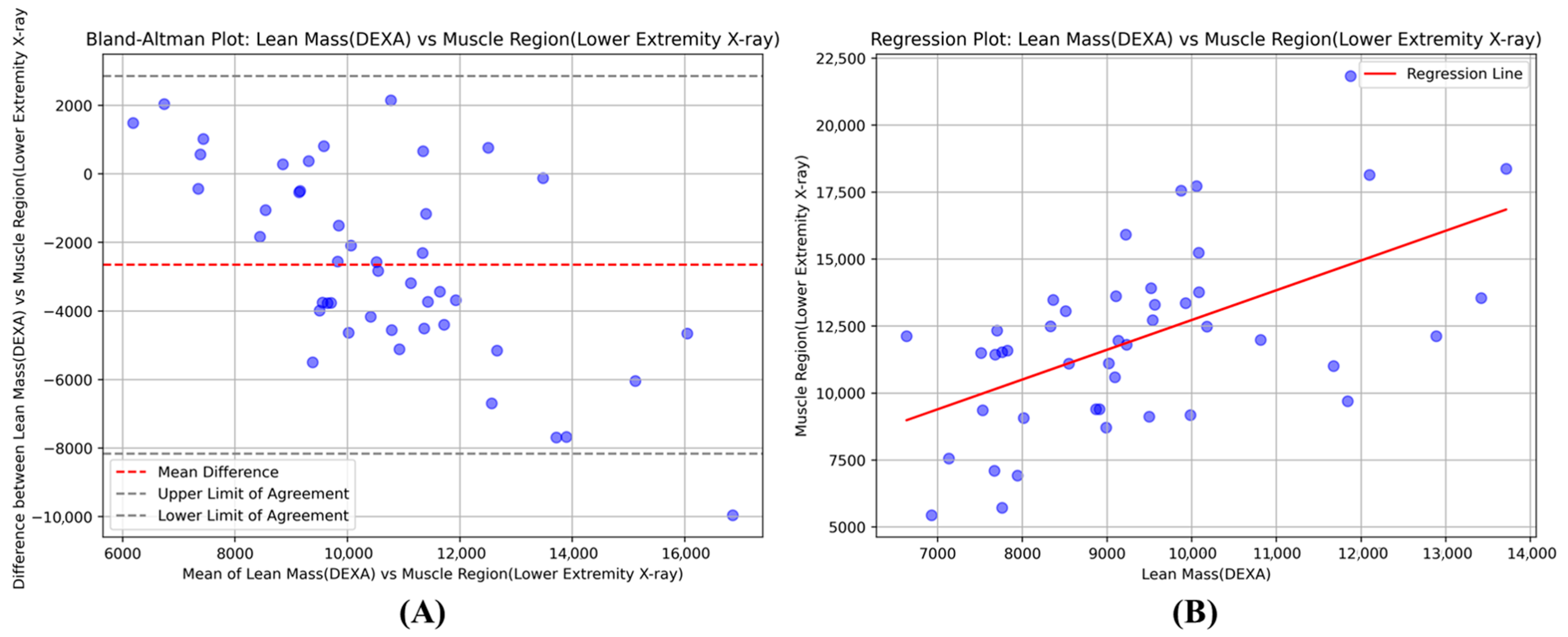 The Bland–Altman analysis provides essential insights into the clinical reliability and measurement agreement between our X-ray-based method and DEXA, particularly relevant for diagnostic applications. The systematic bias of −2653 g indicates that our model consistently underestimates muscle mass compared to DEXA measurements. While this systematic underestimation represents a predictable offset that could potentially be addressed through calibration protocols, it is an important consideration for diagnostic implementation. The 95% limits of agreement ranging from −8.158 kg to +2.851 kg represent the expected range of measurement differences between the two methods for individual patients.