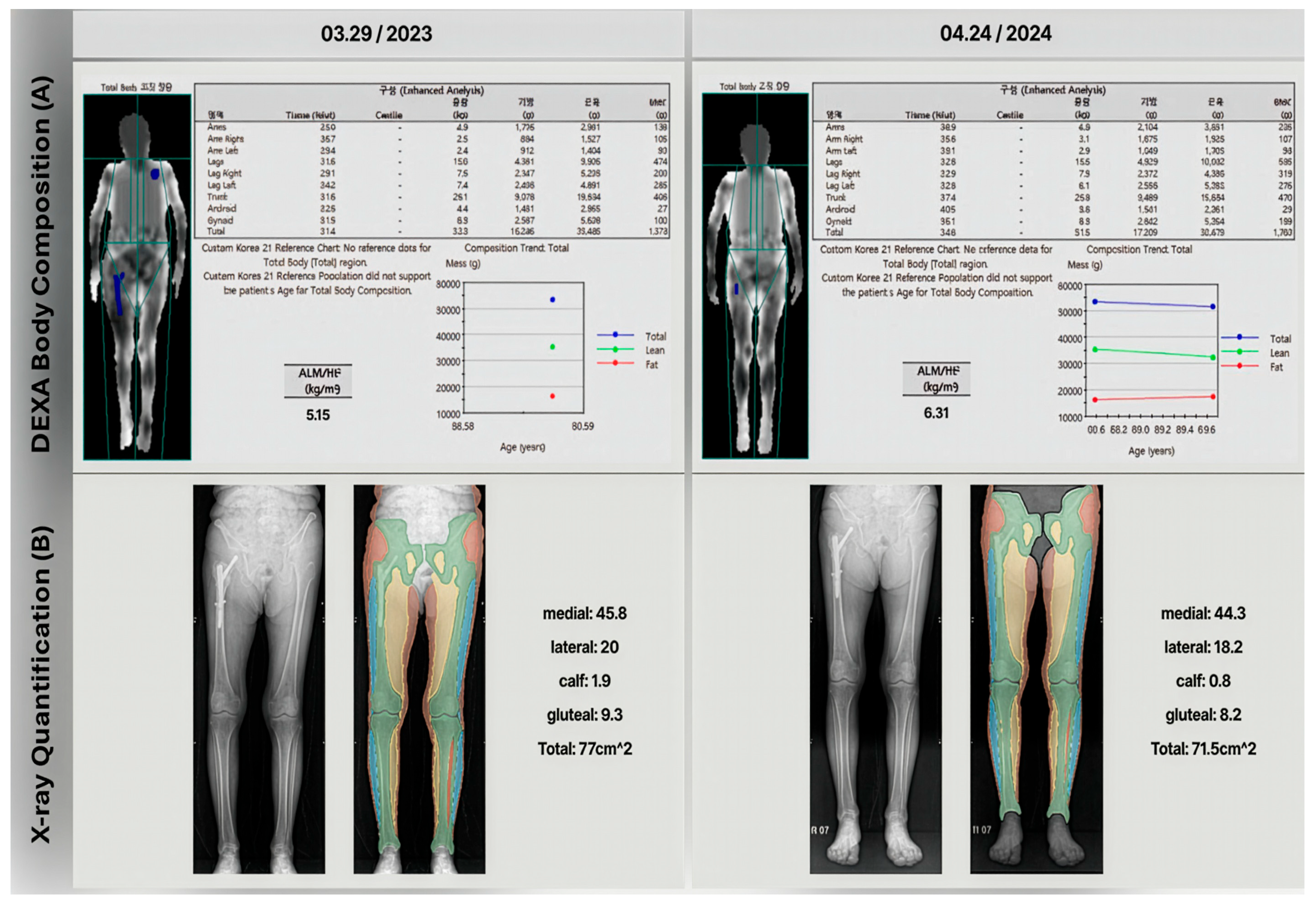2, 22.5% increased), incorrectly suggesting an improvement from severe sarcopenia to not severe sarcopenia. However, gait analysis results contradicted the DEXA findings and lower extremity X-rays revealed significant muscle area loss (from 77 to 71.5 cm