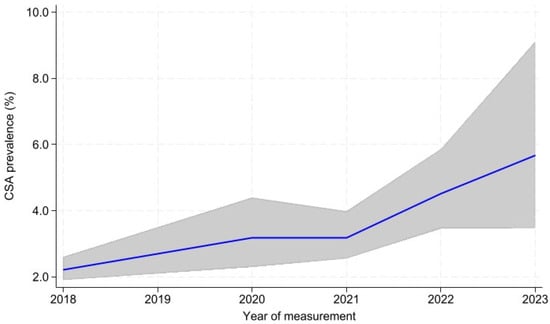 To conduct the statistical analysis, we used the complex sample design of the 2018, 2020, 2021, 2022, and 2023 National Health and Nutrition Surveys, which includes the use of weights, strata, and primary sampling units, all of which are nationally representative. The variables of interest (per survey) were explored, obtaining proportions with 95% confidence intervals (95%CIs). The prevalence of CSA was estimated by survey year and sociodemographic characteristics. The estimate of CSA proportions with their corresponding confidence intervals per year was obtained using a weighted mean of a binary variable, and to calculate the variance of this estimated proportion, the Taylor linearization method was used, which takes into account the stratified design, the primary sampling units, and the sample weights specific to ENSANUT.