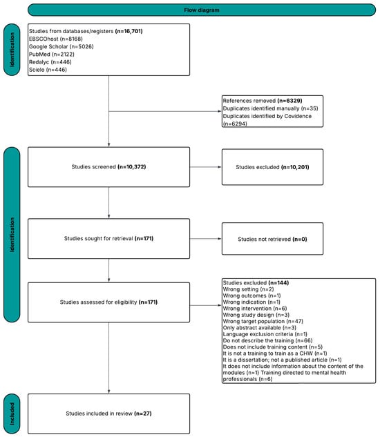 A total of 16,701 publications were evaluated by independent reviewers using Covidence during the screening process (Figure 1). Of these, 6329 were identified as duplicates and removed. The remaining 10,372 references were considered potentially relevant and underwent title and abstract screening resulting in the exclusion of 10,201 articles that were not relevant to our study. A total of 171 articles proceeded to full-text review, of which 144 were excluded because they did not meet the inclusion criteria. Ultimately, 27 articles were included for comprehensive data extraction analysis. The main reasons for exclusion at the full-text stage were that many articles did not describe training components, focused on health professionals other than CHWs, or lacked empirical data. Additional records consisted of editorials or opinion pieces, which were also excluded. These were categorized as research articles (n = 16), training materials (n = 7), curricula (n = 1), and others (n = 3).