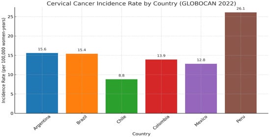 The two countries with the highest rates of CC diagnosis in LATAM are Bolivia (36.6 cases per 100.000 women-years) and Paraguay (34.1 cases per 100.000 women-years). Conversely, between 1988 and 2017, a marked decline in CC incidence was observed in countries such as Ecuador, Chile, Brazil, Colombia, and Costa Rica [1]. Figure 1 presents a compilation of current CC incidence rates for several LATAM countries.