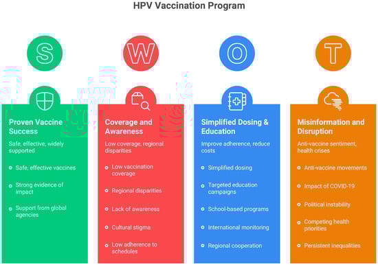 Additionally, policy interventions could play a critical role in increasing HPV vaccine uptake. Some countries, such as the United Kingdom and Australia, have implemented mandatory school-based vaccination programs, which have resulted in higher coverage rates and a significant decline in HPV-related diseases [55,56]. In LMICs, introducing financial incentives or expanding publicly funded vaccination could help overcome cost barriers and expand access to vulnerable populations [28]. A comprehensive overview of strengths, weaknesses, opportunities, and threats related to HPV vaccination in Latin America is exemplified in Figure 2, providing a structured framework to guide these policy decisions.