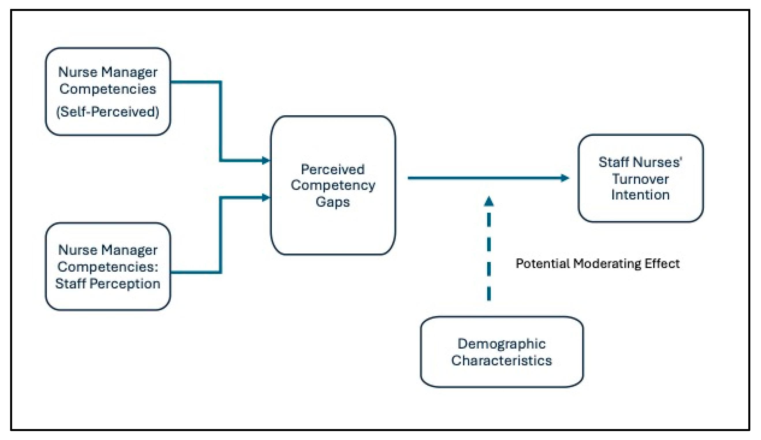 Figure 1) depicts the relationships among nurse manager competencies, perceived competency gaps, staff nurse turnover intention, and demographics as potential moderators. Competencies (independent variable) are measured across NMCI domains salient to unit practice (e.g., retention, supervision, staff development, safety/quality, quality improvement) [