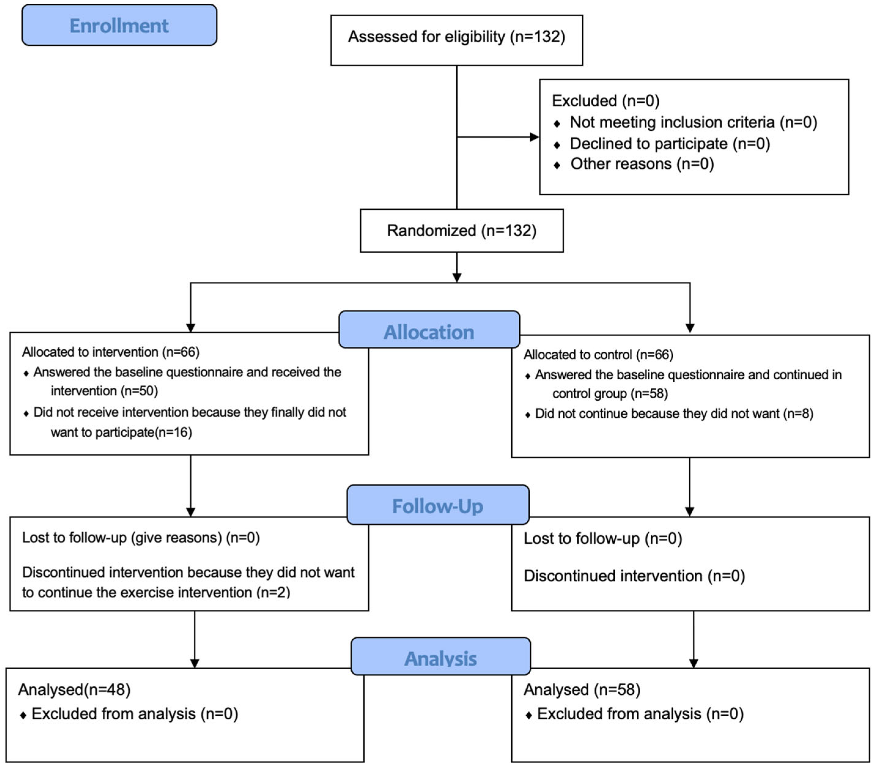 A total of 132 people were randomized and invited to participate. The final sample was n = 108 nursing students with n = 58 in the control group and n = 50 at baseline in the intervention group (81.81% response rate). Two people stopped participating during the intervention in the IG because they indicated they did not have time for the sports sessions. The flow diagram is shown in Figure 1.