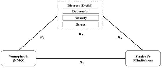 Nomophobia has also been connected with poor cognitive functioning and concentration among students. Overuse of smartphones has been found to lead to distractions, shorter attention spans, and failure to maintain focus on study material [1]. For instance, a study by Aldhahir, M. [13] indicated that students who had greater levels of nomophobia were more susceptible to study disruption brought about by the overuse of smartphones. Similarly, a study by Al Ali and Matarneh [14] indicated that smartphone addiction was found to be negatively related to academic performance. Therefore, it is likely that nomophobia interferes with the concentration of the students. These findings stipulates that the greater the extent of nomophobia, the more it undermines the concentration of the students. Some studies, however, also noted that the relationship between nomophobia and concentration is not necessarily direct, and mediating variables such as distress may have a role to play [15,16]. Therefore, we hypothesized that nomophobia has a negative direct effect on student mindfulness (H1).