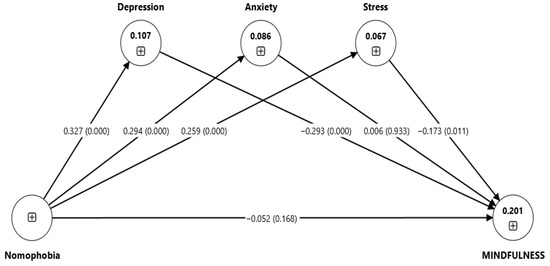 The mediation analysis further revealed notable indirect effects. Nomophobia negatively affected mindfulness through depression (β_4a = −0.096, p-value < 0.001, 95% CI [−0.14, −0.06]) and stress (β_4c = −0.045, p-value < 0.020, 95% CI [−0.08, −0.01]), supporting H4a and H4c. These results indicate that depression and stress completely mediate the connection between nomophobia and mindfulness, since the direct influence of nomophobia on mindfulness was insignificant. This suggests that the negative impact of nomophobia on mindfulness operates entirely through the mechanisms of increased depression and stress. However, the indirect effect through anxiety was not significant (β_4b = 0.002, p-value < 0.934, 95% CI [−0.04, 0.05]) rejecting H4b. Taken together, these findings indicate that depression and stress completely mediated the relationship between nomophobia and mindfulness, while anxiety did not function as a mediator. The direct path from nomophobia to mindfulness was not significant. However, the indirect paths through depression and stress were significant, indicating indirect-only (complete) mediation. Anxiety did not significantly mediate the nomophobia–mindfulness relationship. This may reflect contextual factors. In our sample, anxiety levels were high but not strongly linked to attentional regulation. Cultural norms around academic stress or adaptive coping strategies may buffer its effect.