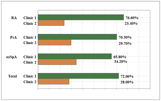 The current study included a total of 261 patients with inflammatory joint disease (IJD). Of them, 124 (47.50%) were diagnosed with rheumatoid arthritis (RA); 64 (24.50%) had psoriatic arthritis (PsA), and 73 (27.90%) had axial spondyloarthritis (axSpA). The patients, who came from two rheumatology clinics in Plovdiv, Bulgaria, were distributed between clinics and diagnoses, as shown in Figure 1. The majority of them (72.00%) were treated at Clinic 1, with a similar distribution of diagnoses between the two clinics (Pearson χ2 = 2.81, df 2, p = 0.245).