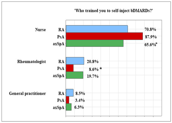 Distribution of patients’ responses to the question ‘Who trained you to self-inject bDMARDs?’ across diagnoses. *—Significant difference at p < 0.05.
