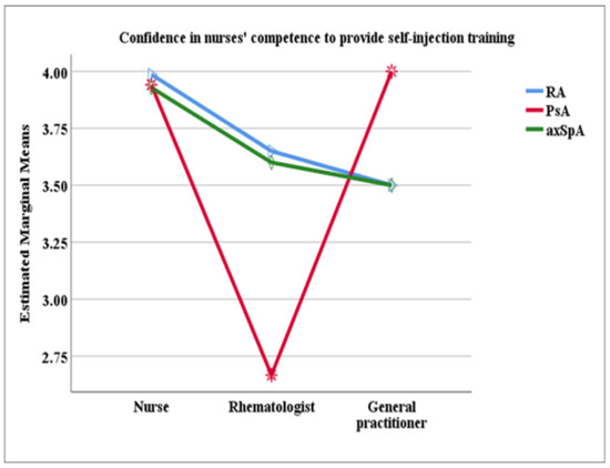 Figure 3 presents the estimated marginal means (EMMs) for patients’ ratings of nurses’ competence to deliver self-injection training, stratified by diagnosis and by the specialist who provided the training. The interaction plot is primarily descriptive due to the small number of observations in some subcategories. Nonetheless, a clear trend is evident for the RA and axSpA groups: patients trained by a nurse expressed the highest trust in nurses’ competence, followed by those trained by a rheumatologist, and the lowest trust was reported by those trained by general practitioners. In contrast, among PsA patients, those trained by a rheumatologist showed the lowest trust in nurses’ competence, whereas those trained by a general practitioner reported the highest confidence in nurses’ competence.