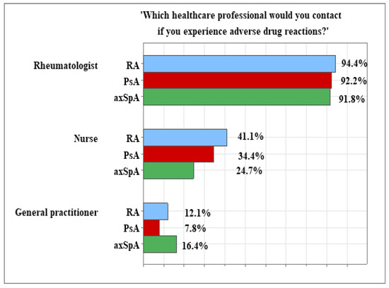 In all groups, the proportions of patients who would contact their general practitioners were small, amounting to 12.10% (n = 15) in RA patients, 7.80% (n = 5) in PsA patients, and 16.40% in axSpA patients, with no significant differences among the diagnoses (χ2 = 7.755, p = 0.101). Figure 4 presents patients’ preferences for a specialist to contact in case of adverse drug reactions.