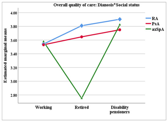 The interaction between diagnosis and social status revealed a slightly different pattern from the one observed in the main effects. The significant differences between the social status groups varied for each diagnosis, as is shown in Table 5. For RA and PsA patients, the trend showed working patients providing the lowest ratings, followed by retirees, with disability pensioners giving the highest ratings. However, for axSpA patients, the lowest ratings were provided by retirees. Across diagnoses and social status, the highest ratings for all three diagnoses were provided by the disability pensioners (Figure 5).
