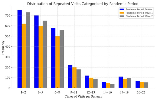 The distribution of repeated visits per patient varied across the pre-pandemic and pandemic periods, as illustrated in Figure 2. Across all timeframes, the majority of patients had between 1–2 and 3–5 visits, with frequencies declining steadily as the number of visits increased. Notably, the pre-pandemic period consistently showed higher frequencies of repeated visits compared to both pandemic waves, particularly in the categories of 1–2 and 3–5 visits. Wave 1 exhibited a slight reduction in repeated visits, while Wave 2 demonstrated the lowest frequencies across nearly all visit ranges. The association analysis indicates a notable shift toward more frequent visits during the pre-pandemic period (χ2 = 486.23, df = 20, p < 0.001).