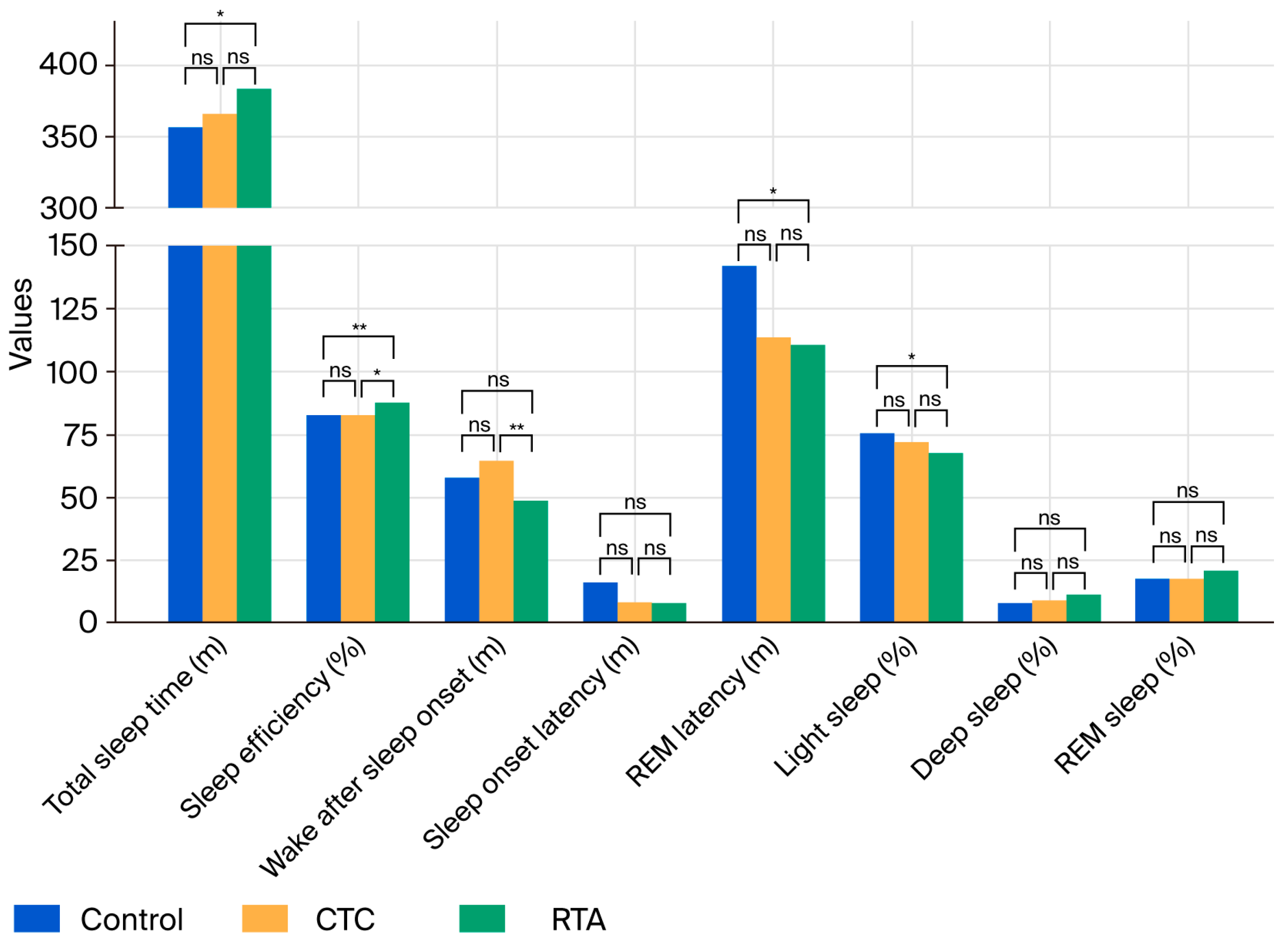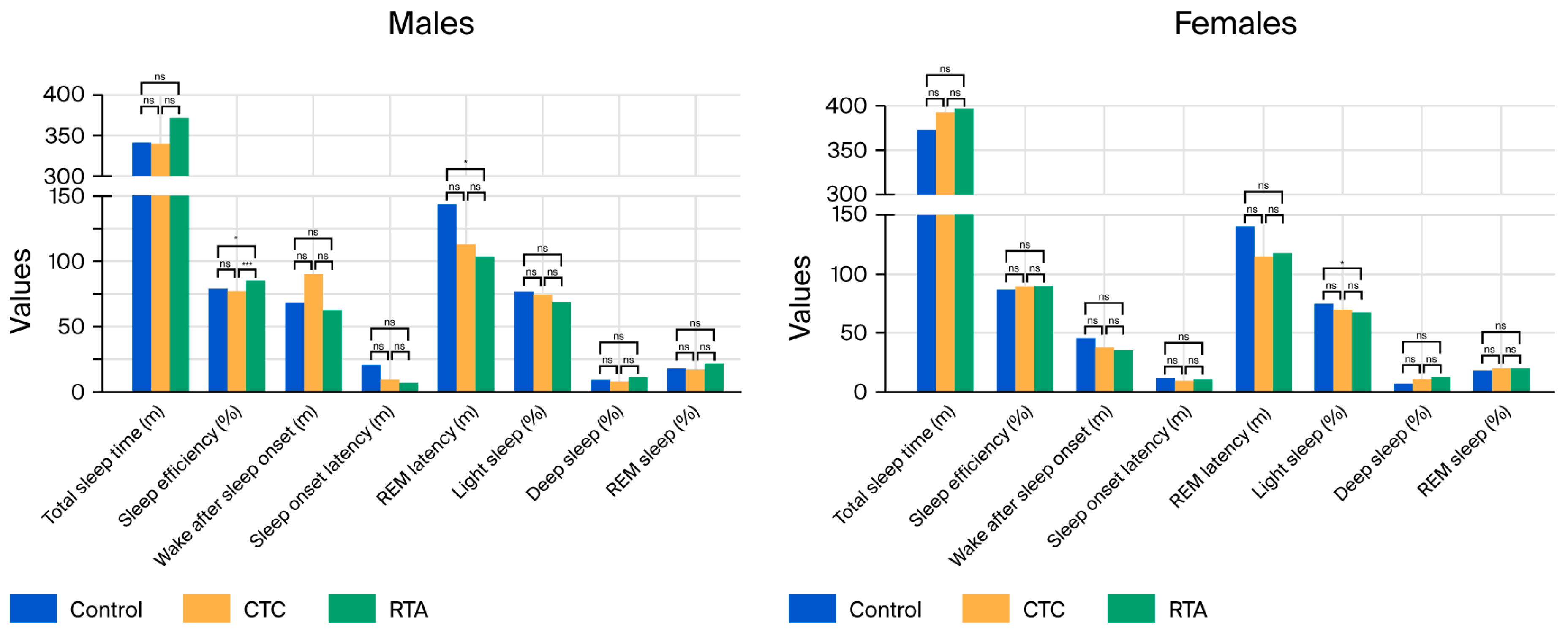 3.2. Comparative Analysis of Sleep Architecture Across Control, CTC, and RTA Conditions