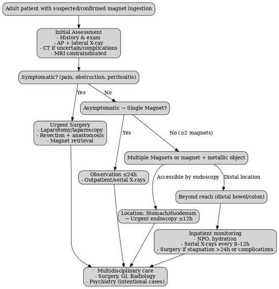 Decision tree for adult management of multiple magnet ingestion. The decision tree integrates pediatric-based principles with adult-specific considerations. It incorporates clear timeframes (≤12 h for urgent endoscopy, 8–12 h intervals for serial X-rays, ≤24 h stagnation before surgery), highlights the role of CT when history is uncertain, and specifies MRI contraindication. Adapted from NASPGHAN/ESPGHAN pediatric guidelines, adult case reports, and adult foreign body guidelines (ESGE, ASGE) [44,45].